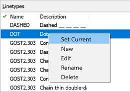 To perform operations with linetypes, the Linetypes dialog also has a context menu: