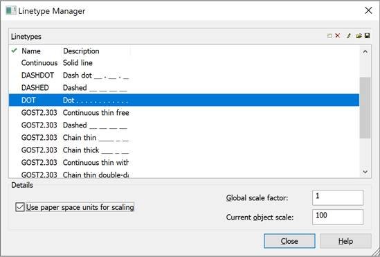 1. In the Linetypes dialog box, select the appropriate linetype by clicking.