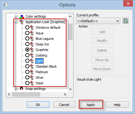 In addition to the possibility of the workplace complete reorganization to the user needs, nanoCAD contains a set of color themes for the interface design. You can change the color theme in the Options dialogue box, the Application look item.