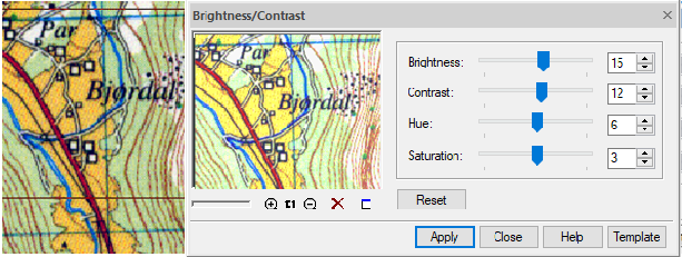 3. In the dialog box, use the corresponding input fields or sliders for changing values of Brightness, Contrast, Hue and Saturation parameters.