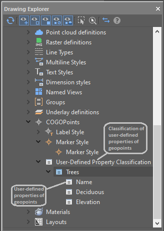 Automatic creation of geopoint groups. All points with the same raw description are combined into one group. As many groups are created as different raw descriptions were found in Geopoints in the drawing. The names of the created groups coincide with the raw descriptions.