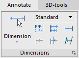 In nanoCAD, the dimensioning commands are available on the Annotate tab of the ribbon, the Dimensions main menu and the Utilities toolbar: