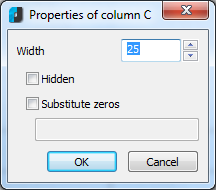 Column properties: | Use to alter the width of the column containing the active cell. A dialog box appears in which the column width, in millimetres, can be specified: ![]() |
