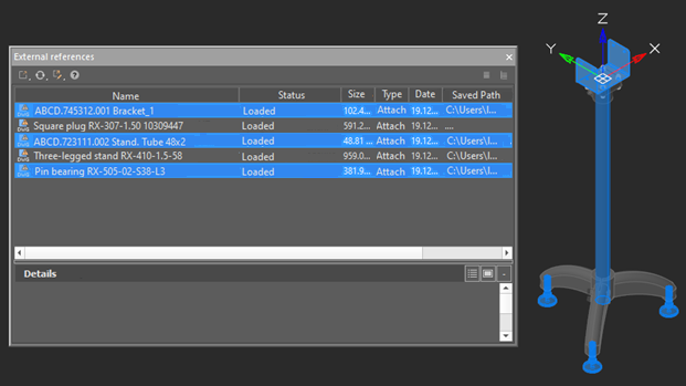 Xrefs selected in the dialog box are automatically selected and highlighted in the drawing. And vice versa: when xref objects are selected in the drawing, their names will be automatically selected in the External references dialog. The ERHIGHLIGHT system variable is responsible for synchronizing highlighting with objects in the drawing. Single and multiple selection is supported (using CTRL and SHIFT):