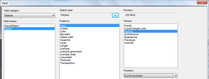 Named object field from Objects category displays names of blocks, views, dimension styles, layers, text styles, linetype styles.