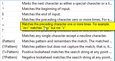 - Use regular expressions. Enables search mode with additional selection conditions. Click the button opposite the parameter and select the required expression from the list that appears. When you hover over a list item, a tooltip appears with a detailed explanation. The choice of expression is made with the left mouse button. Multiple regular expressions can be used together.
