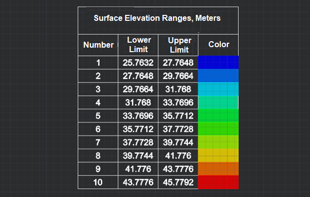 The Formation of a Legend command outputs a legend into the drawing in the form of a dwg table for the selected network, colored by height