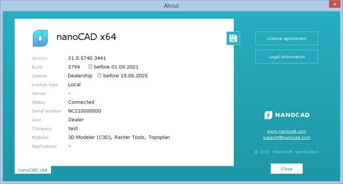 The* About* dialog box shows the license number, who registered the program, a link to the developer’s website – www.nanocad.com and an email link for technical support – support@nanocad.com