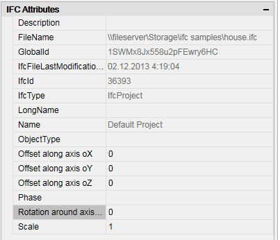 When selecting a tree node (object), its attributes are displayed on the “IFC properties” functional panel. Each object type has its own set of attributes.
