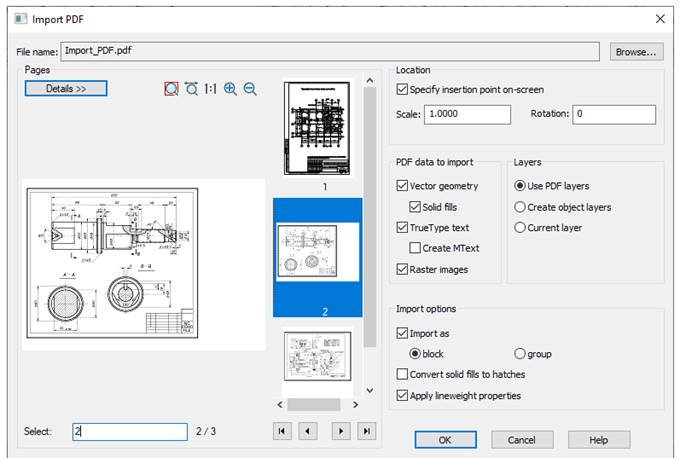- Import data of the entire PDF file or a selected page as nanoCAD objects.