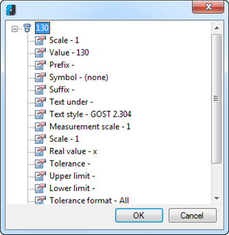 Take from property: | The command takes the values of any parameter from the selected nanoCAD objects on the drawing (dimension, leader, table, etc.). The parameters values of the selected object are displayed in the list in the new window: ![]() |