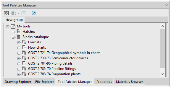 To save drawing space, tool palettes can be combined. In this case only the active palette will be displayed on the screen, while the rest ones combined with it will be displayed as bookmarks. You can switch between combined palettes using bookmarks located in the bottom of the active palette.