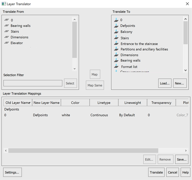 | Load… | Loading layers into the Translate to list from a drawing (.dwg), template (.dwt) or standards file (*.dws). If the downloaded file already contains a Layer Translation Mappings table (files created using the Save… button), then this information will be displayed in the Layer Translator window. You can load layers from multiple files into one drawing. When loading files with same name layers, the layer loaded first is included in the Translate to list. Likewise, the loading of a mapping table element is canceled if it matches one in the drawing. |