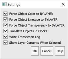 | Force Object Color to BYLAYER | Configures the color of objects when translating layers. Applicable for objects that have Color set other than By Layer. When the ox is checked, the color of such objects will change to By layer; when the box is unchecked, the color of the objects will remain unchanged |
