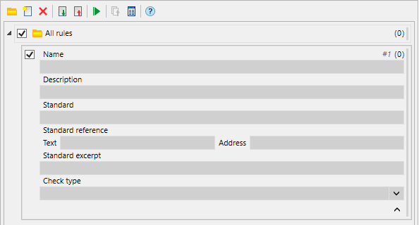 The panel is used to configure rules and run checks of these rules. It consists of the main menu and the rules tree. Each rule has its own unique number, value with the symbol “#”.