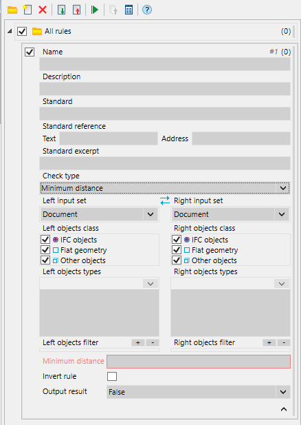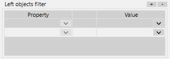 Depending on the type of check, one (left) or two (left and right) sets of objects can be used. Each set has its own: input set, objects class, objects types, objects filter.