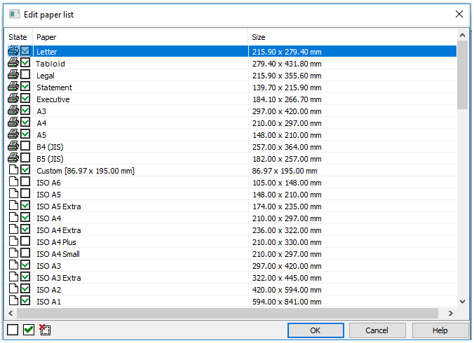 The dialog box contains the list of all available paper formats that can be included in the list.