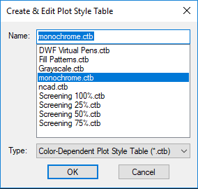 Plot style editor allows you to add, delete, copy, rename and edit the plot style tables. First the Plot style dialog box is opened, where the type of plot style table is selected (Color-dependent plot style table (.ctb) or Named plot style table (.stb):