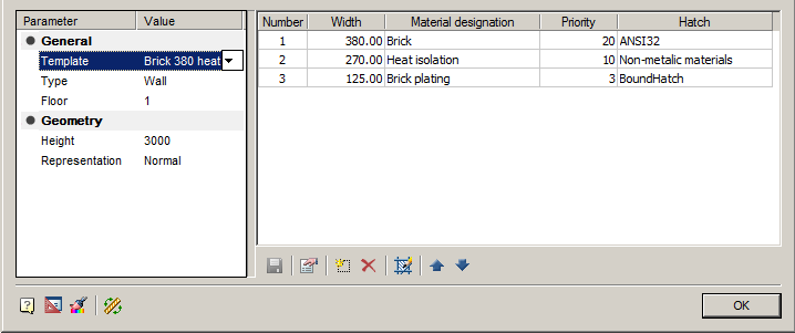 The main parameters of the wall are displayed on the left side of the dialog box. In the right part of the dialog is set composition of the wall. In this case it is possible to create multi-layered walls.