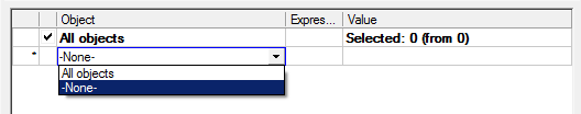 “Object” – displays objects and their parameters. If you selected the search area “In the whole document” or “In the current space” you must add objects yourself. In the “Object” column, select the desired type of object from the drop-down list of the cell. To deselect or remove an object from the table, select the “None” value.