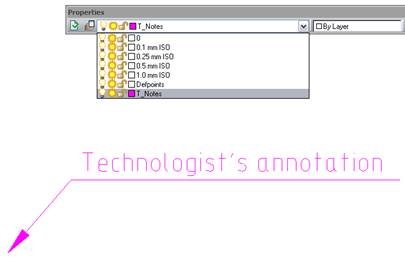 4. Create an annotation using the Notes>Universal notes command from the Draw menu. When the first annotation is being created, a new T_Notes layer is created on the Notes layer base: