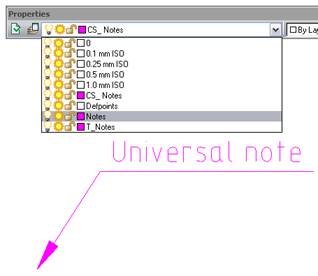 4. Create an annotation using the Notes>Universal notes command from the Draw menu. When the first annotation is being created, a new CS_Notes layer is created on the Notes layer base: