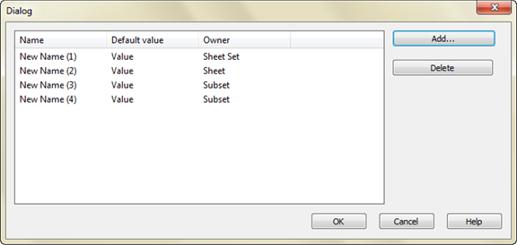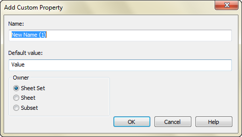 Click the Add… button to open the Add Custom Property dialog. Enter new property name, default value (this value is added for the first time) and use radio buttons to choose the owner of the custom property: sheet set, sheet or sheet subset.