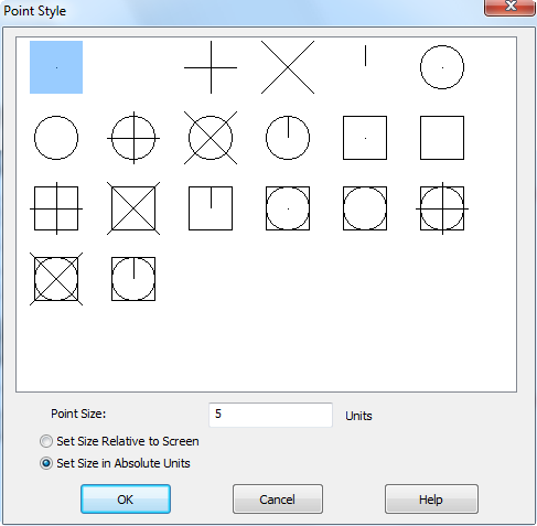 The Point Style dialog box is used to display and change the current style and size of a point. The current display style of the point is highlighted. Click on any symbol to change display style.