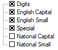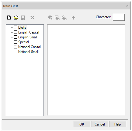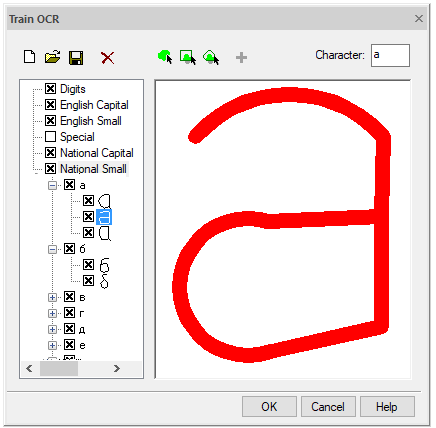 The left part of the dialogue box display the sections of the current pattern library: digits, English capital, English small, special, national capital, national small. Closed and non-empty sections are marked with “+” sign.